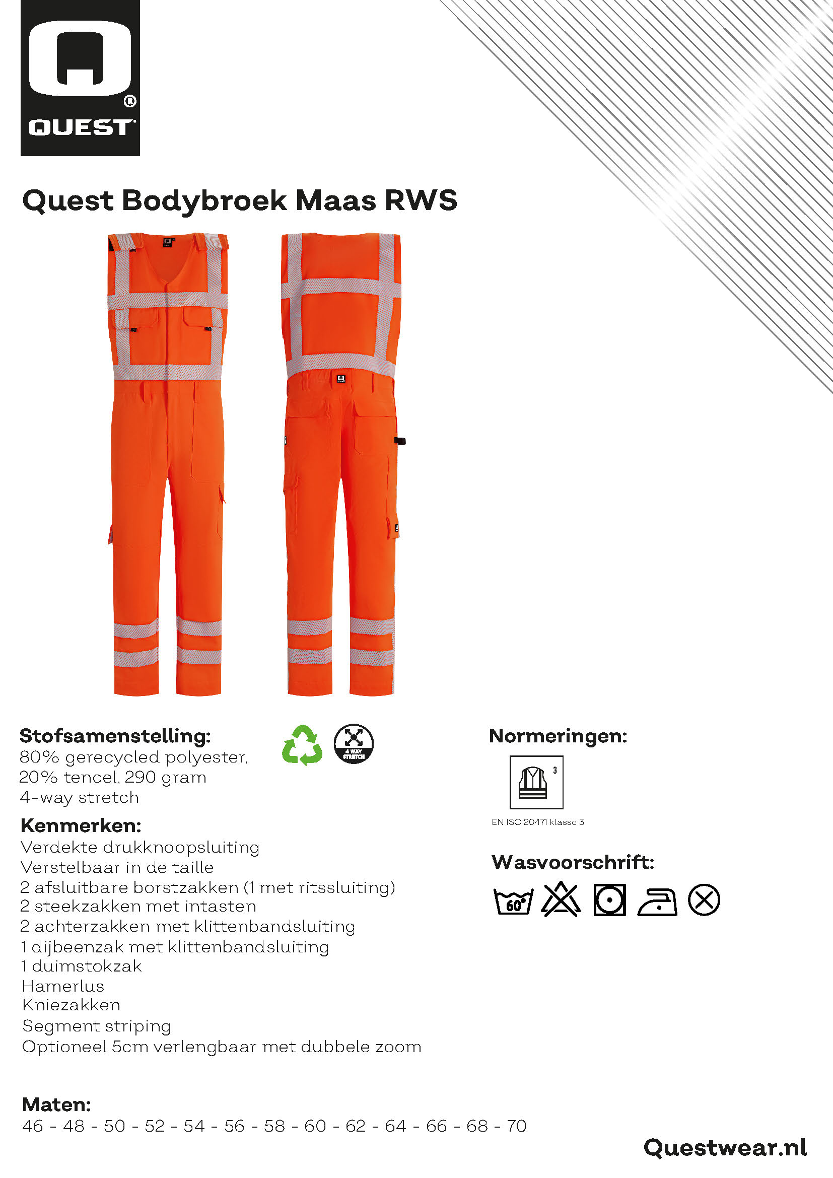 Deze bodybroek maakt deel uit van de Quest RWS-collectie. Wij kunnen bijpassende RWS-bovenkleding professioneel voorzien van een bedrijfslogo, met behoud van zichtbaarheid en certificering.